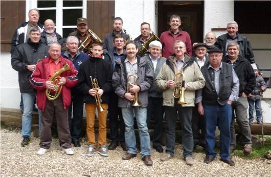 Schon bald packen die „Adjuvanten“ ihre Instrumente für ein erstes Ständchen aus. Obwohl die Runde im Laufe der Jahre leider (altersbedingt) geschrumpft ist, ist sie dennoch erfreulicherweise vielfältig: Von Klarinette über Trompete, Posaune, Flügelhorn, Bassflügelhorn (Tenorhorn) bis hin zur Tuba ist noch immer alles vertreten – auch Dank vielseitiger Musikanten wie Rudi Krestel, der nicht nur Trompete spielt, sondern auch gerne mal zur Posaune greift. Zuweilen ist es sogar noch „bunter“, wenn einige, nicht regelmäßig Teilnehmende anwesend sind, beispielsweise Ingo Wolf mit seinem Saxophon oder Karl Ottinger mit dem Akkordeon.